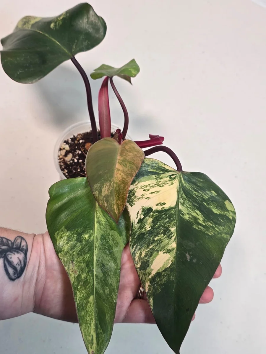 Introduce an extraordinary touch to your indoor plant collection with the variegated philodendron strawberry shake. This highly sought-after live plant is renowned for its breathtaking foliage, featuring large, heart-shaped leaves that display an incredible tapestry of colors. Each leaf is a unique masterpiece, predominantly green, yet adorned with striking splashes of creamy white, delicate pink, and rich burgundy red. The vibrant ‘strawberry shake’ variegation makes this philodendron a true collector’s gem and a captivating conversation starter. Ideal for anyone looking to enhance their living space with a rare and visually stunning botanical specimen, this rare philodendron plant thrives indoors, adding a tropical flair to any room.