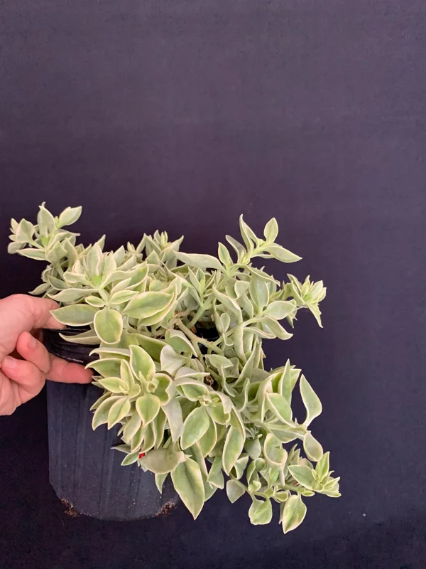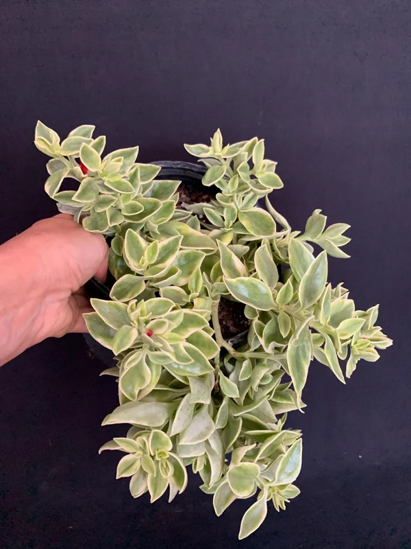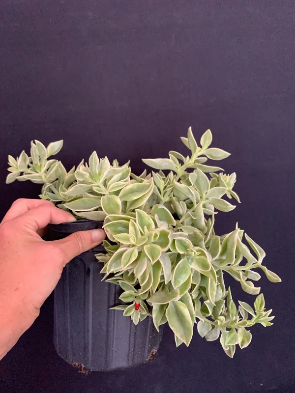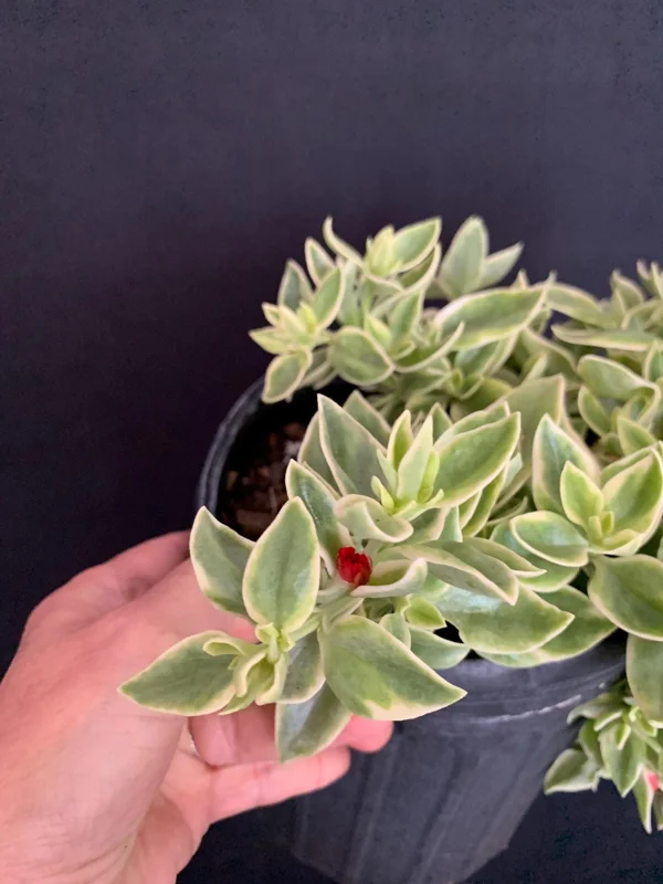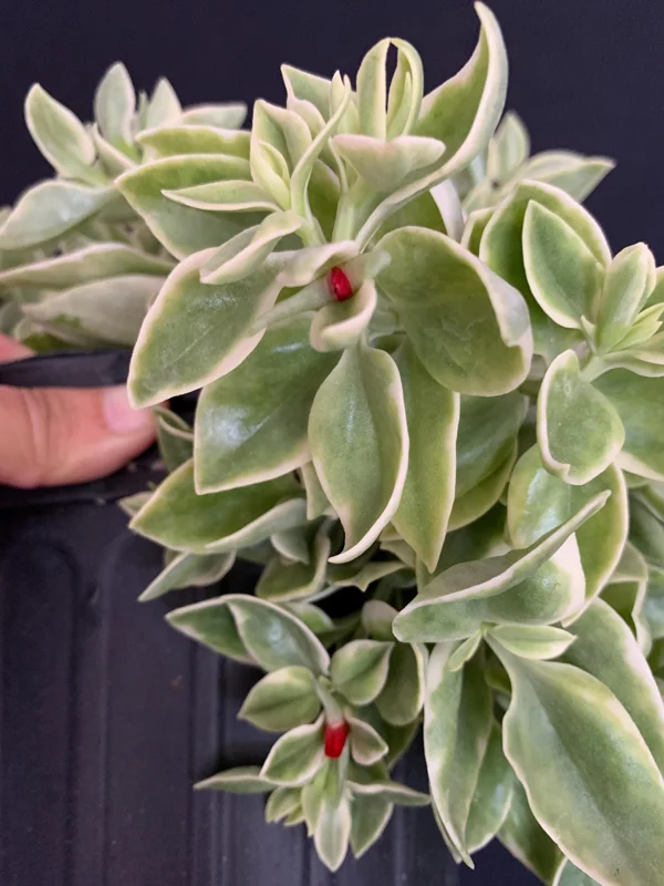 - Q: How big does this plant get? A: The Variegated Red Apple Succulent typically grows to about 4-6 inches tall with a vigorous trailing spread of 12-14 inches wide, making it excellent for covering ground or cascading from containers.
