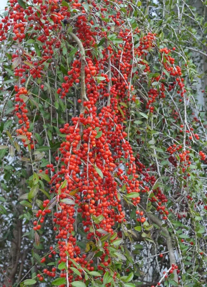 - Q: Does this plant produce berries? A: Yes, female weeping yaupon holly live plants produce bright red berries in fall and winter, which are attractive to birds and add significant visual interest.