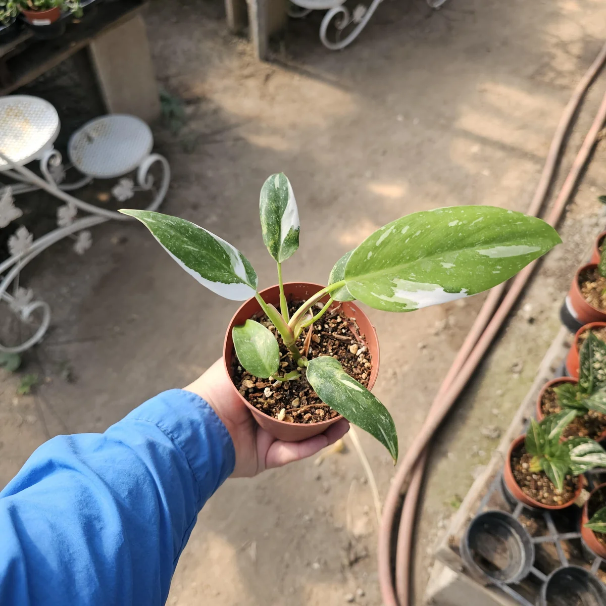 The plant is shipped in its nursery pot to minimize stress during transit, ensuring it arrives in the best possible condition. You can either keep it in its current 4in pot for a while or repot it into a slightly larger pot (e.g., a 6-inch pot) once it outgrows its container, typically indicated by roots emerging from the drainage holes. Expect to see new variegated leaves emerge regularly, showcasing the unique beauty of this philodendron houseplant.
