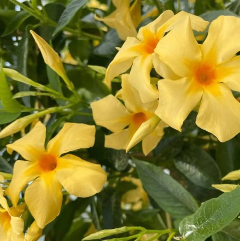 This particular variety of Mandevilla (Sanderi) is renowned for its resilience and ability to thrive in warm, sunny conditions. While it is sensitive to cold temperatures, making it an annual in cooler climates, it can be overwintered indoors in many regions. The plant’s natural climbing habit allows it to beautifully adorn any support structure, creating a wall of vibrant blooms. Its striking yellow flowers provide a bold contrast against its dark green foliage, ensuring it stands out in any garden design. Whether you’re an experienced gardener or just starting, the Mandevilla offers a relatively low-maintenance option for high-impact beauty, making Mandevilla care accessible for many.