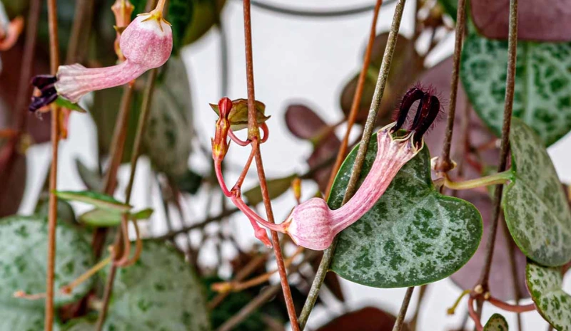 If you’re expecting big, dramatic flowers, the String of Hearts might not be the showiest bloomer. However, its small, delicate flowers have a unique charm. These blooms are about an inch long, with a tubular shape and a bulbous base, resembling tiny enclosed beads—one of the reasons this plant is also called the rosary vine.