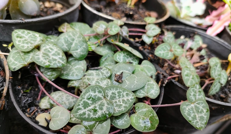 Its leaves are a stunning gray-green with marbled patterns, and the delicate, thread-like vines take on a beautiful purplish hue. Give it a little trim now and then to encourage bushier growth, and watch it flourish! Left unpruned, these vines can cascade up to 12 feet long—a true showstopper in any plant collection.